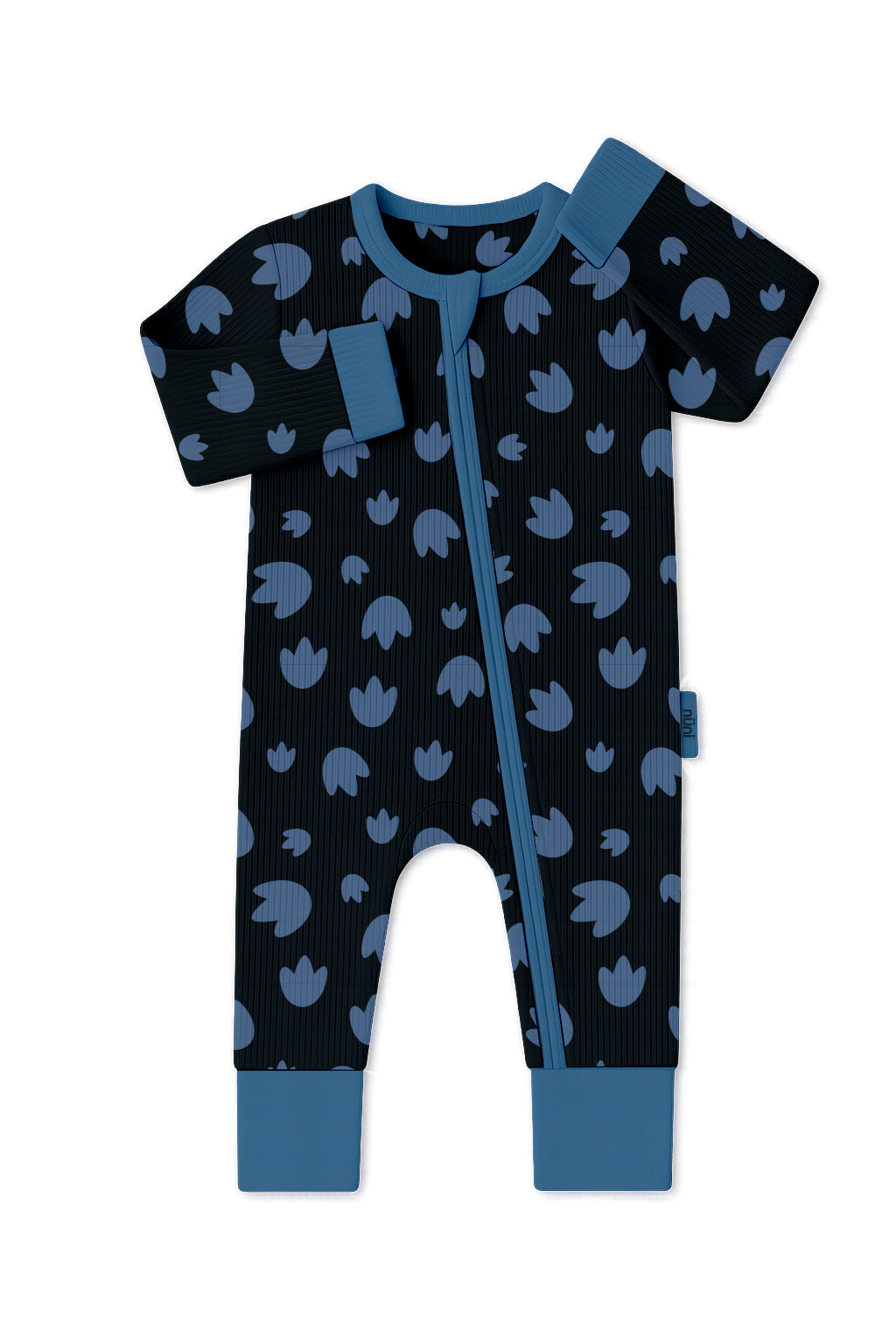 This adorable one-piece pajama is designed with a deep black background and a print of dinosaur footprints in blue tones, evoking the magic of prehistoric worlds. With matching blue cuffs and details, it’s perfect for little adventurers who dream of exploring distant lands while sleeping comfortably. Its wrap-around design provides warmth, freedom of movement, and a unique style for both nighttime and naptime.